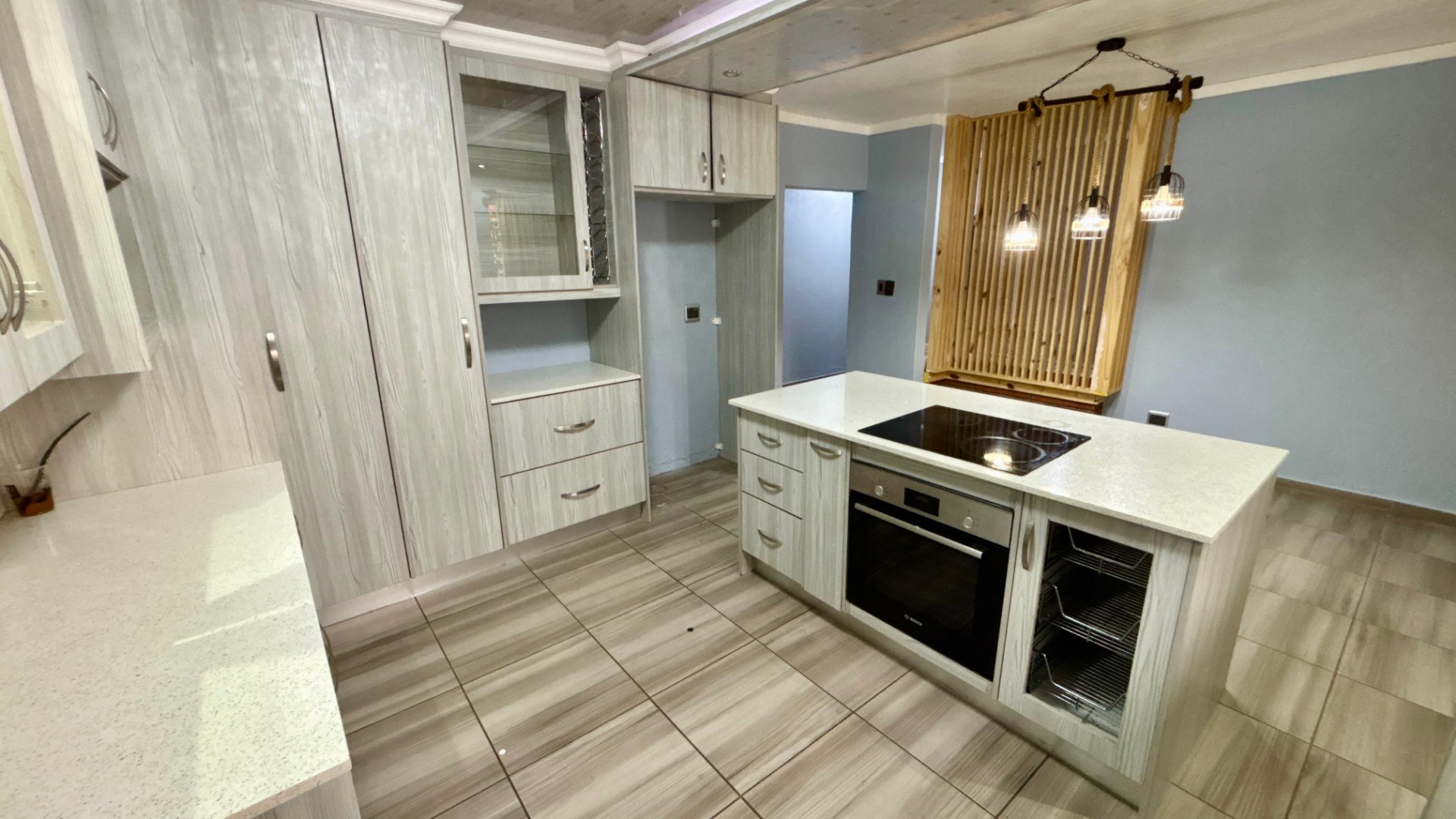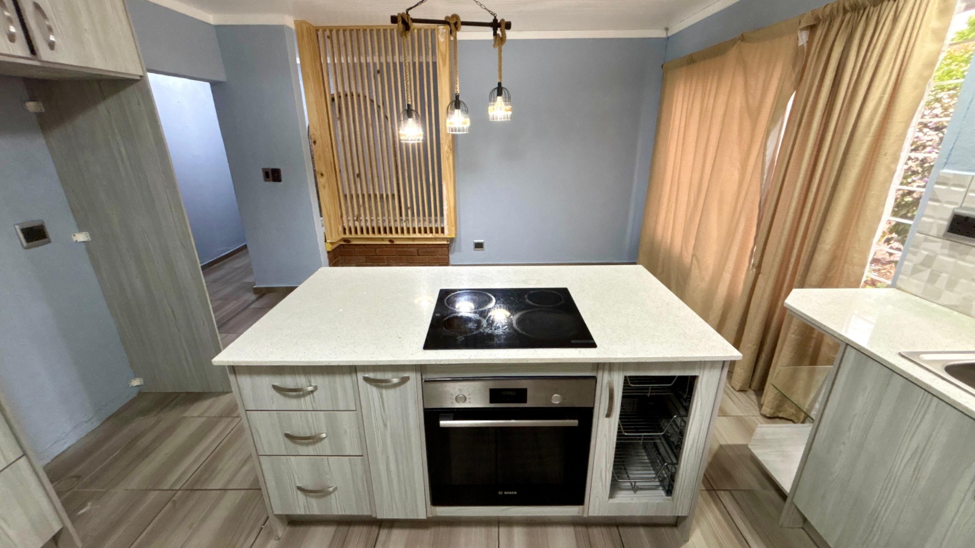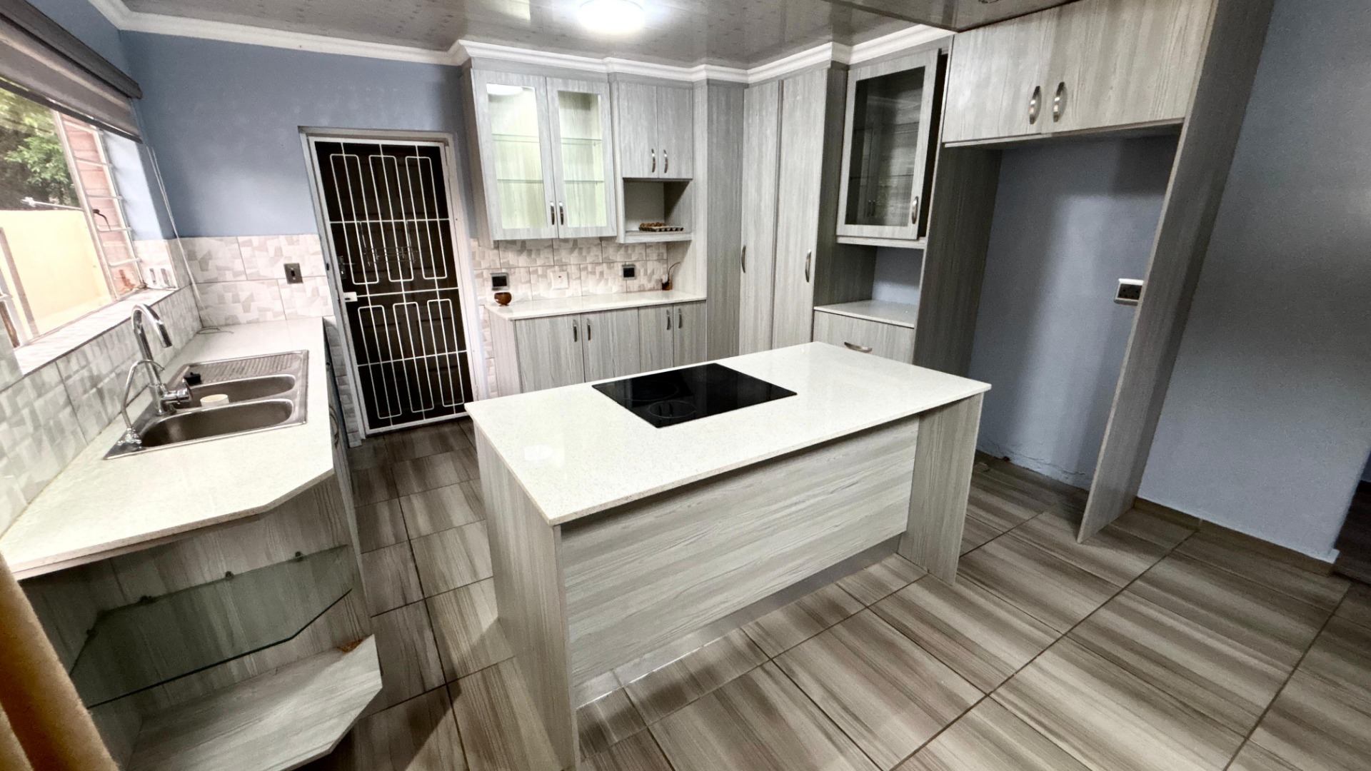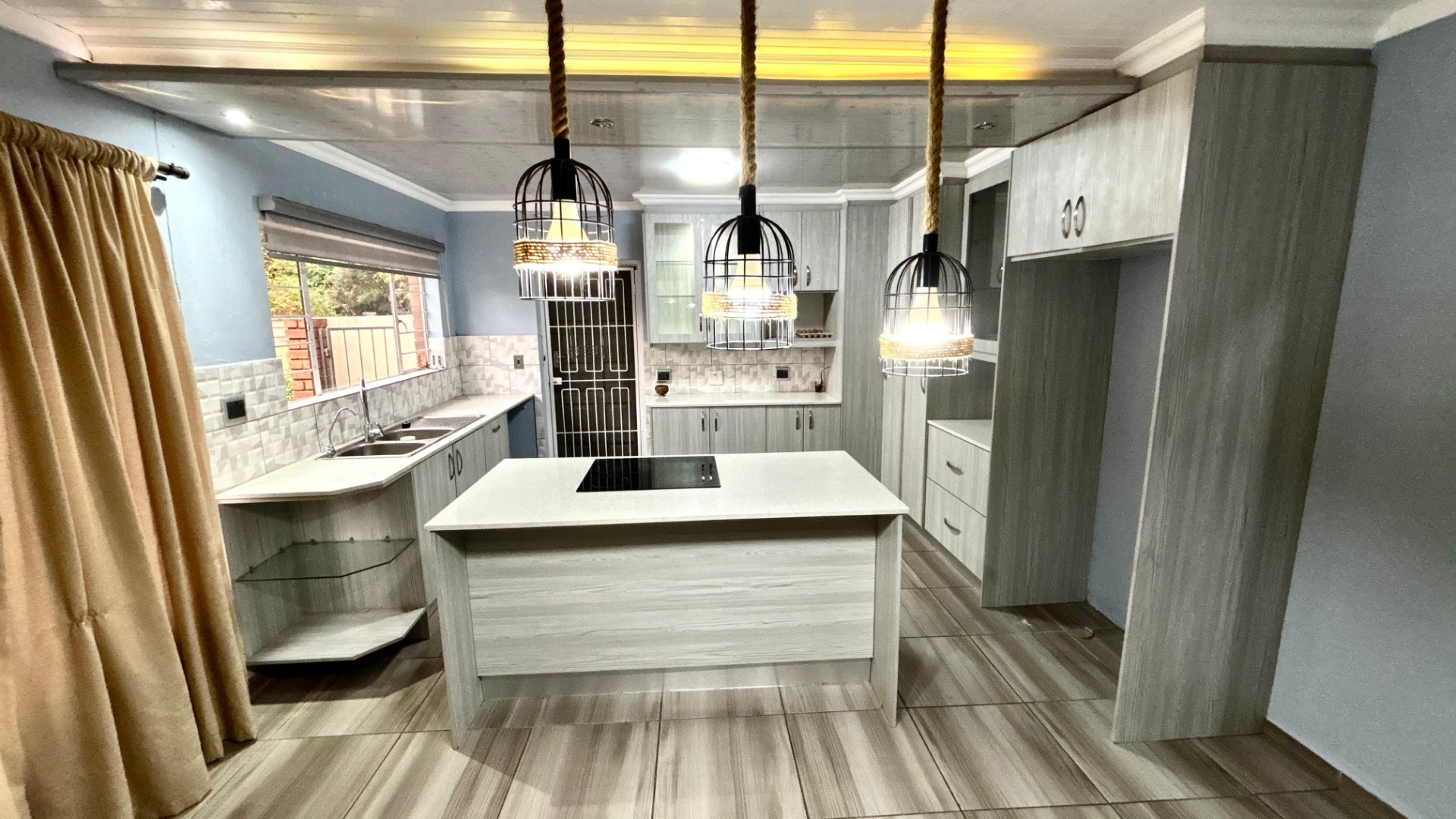 Central to the home is a modern kitchen, meticulously appointed with stylish grey wood-look cabinetry and clean light countertops. It features a functional central island equipped with an integrated hob and oven, complemented by unique industrial-style pendant lighting. Ample storage is provided through various cabinets, including glass-fronted units and a pantry-style section, alongside a double sink positioned beneath a window. A dedicated space for a double-door refrigerator ensures convenience.