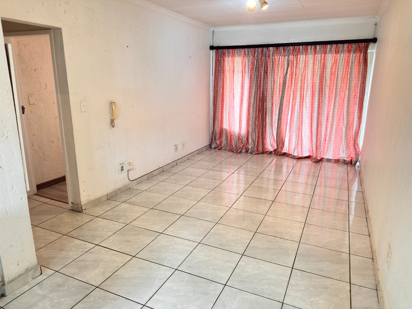This 84 sqm apartment offers an inviting open-plan living experience. The functional L-shaped kitchen features light cream cabinetry, dark speckled countertops, a tiled backsplash, a built-in oven and hob, and a practical double sink with a breakfast bar. The adjacent lounge, ideal for a family TV room, boasts durable tiled flooring and natural light, creating a versatile space for relaxation. Sliding doors enhance the flow.