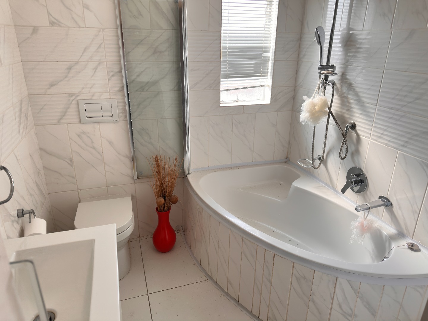 The residence comprises two comfortable bedrooms, each featuring modern laminate flooring and ample storage with built-in wardrobes and integrated over-bed units. Large windows invite natural light. The contemporary bathroom is elegantly finished with white marble-effect tiling, a corner bathtub with integrated shower, a wall-mounted toilet, and a sleek sink, ensuring a fresh and functional space.