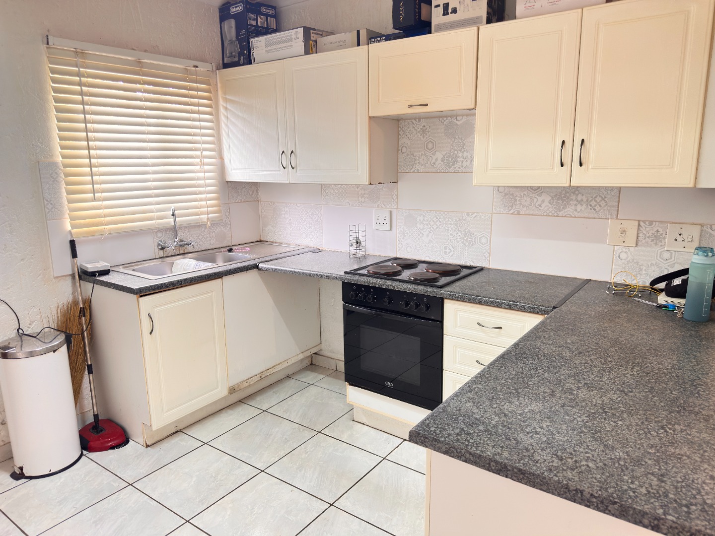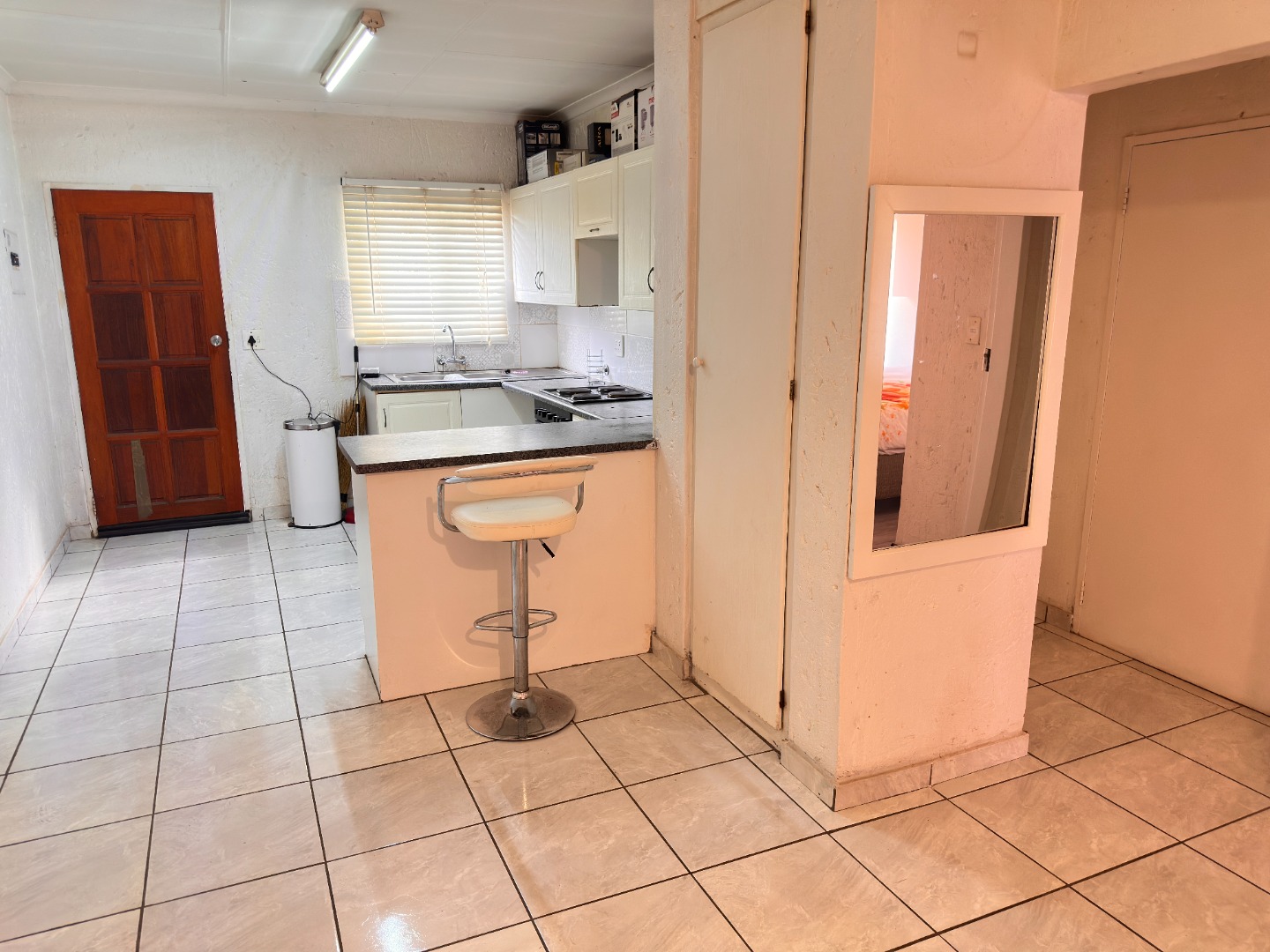 This 84 sqm apartment offers an inviting open-plan living experience. The functional L-shaped kitchen features light cream cabinetry, dark speckled countertops, a tiled backsplash, a built-in oven and hob, and a practical double sink with a breakfast bar. The adjacent lounge, ideal for a family TV room, boasts durable tiled flooring and natural light, creating a versatile space for relaxation. Sliding doors enhance the flow.
