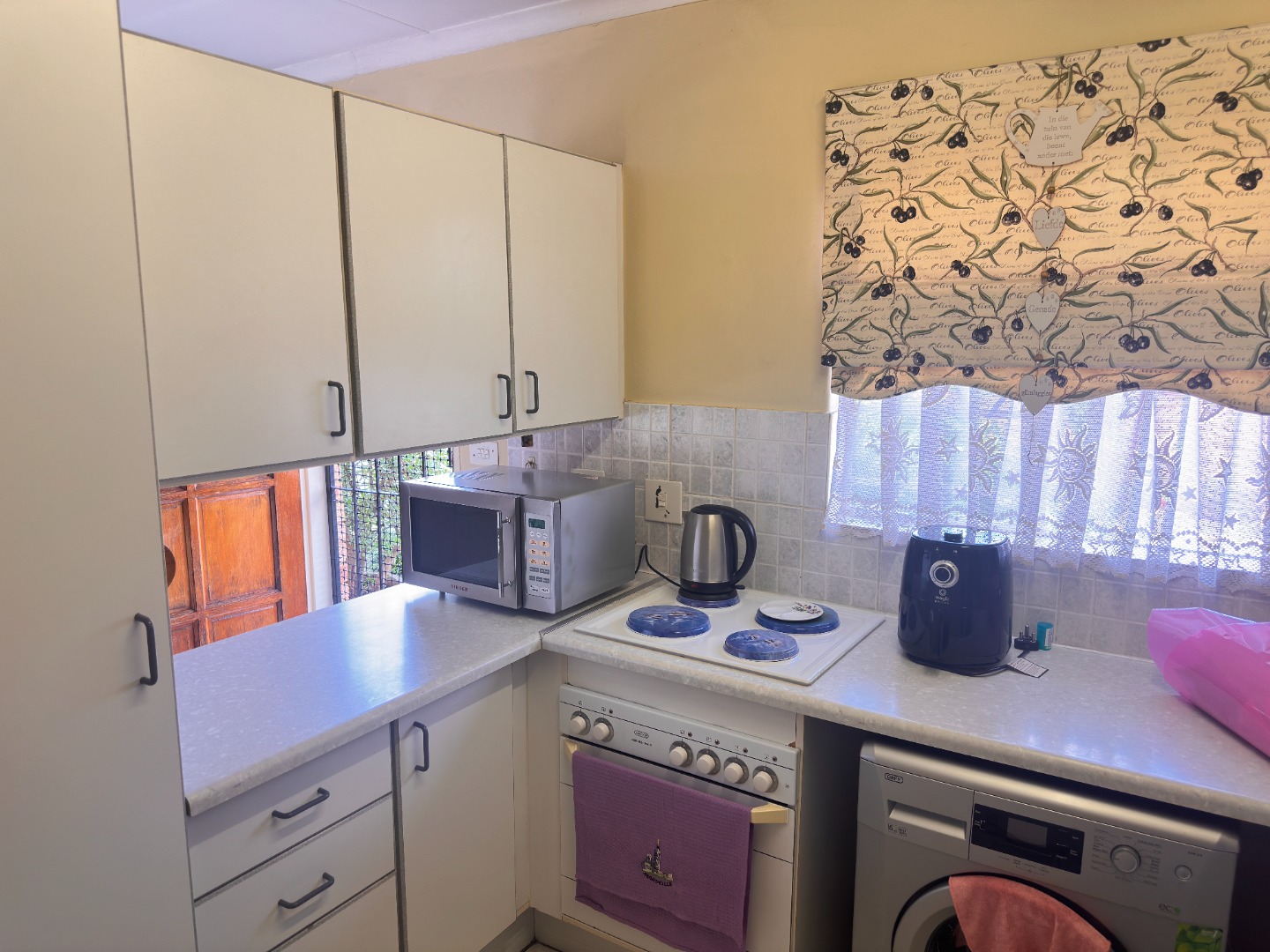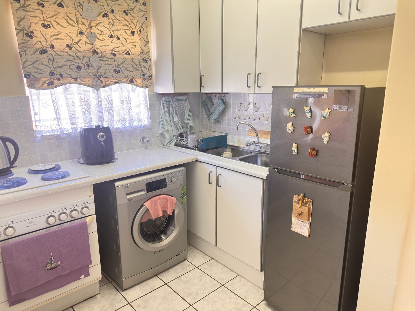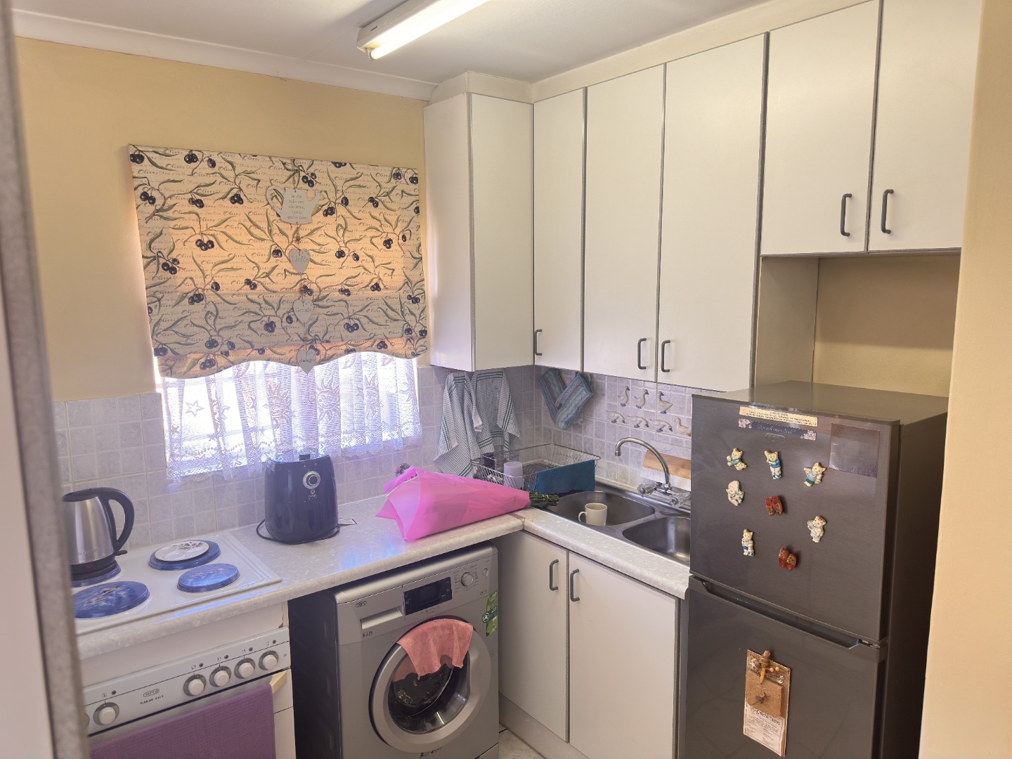 -Kitchen with ample cupboard space, a single door fridge and
