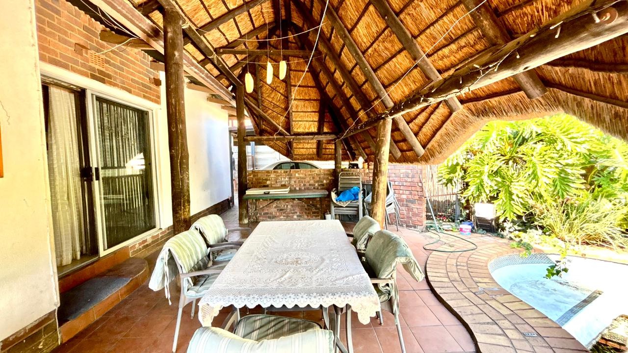 Carports on both sides of the house provide secure parking with safety gates, offering ample space for multiple vehicles, a caravan, or a trailer. The backyard includes a lapa and built-in braai, ideal for entertaining family and friends.