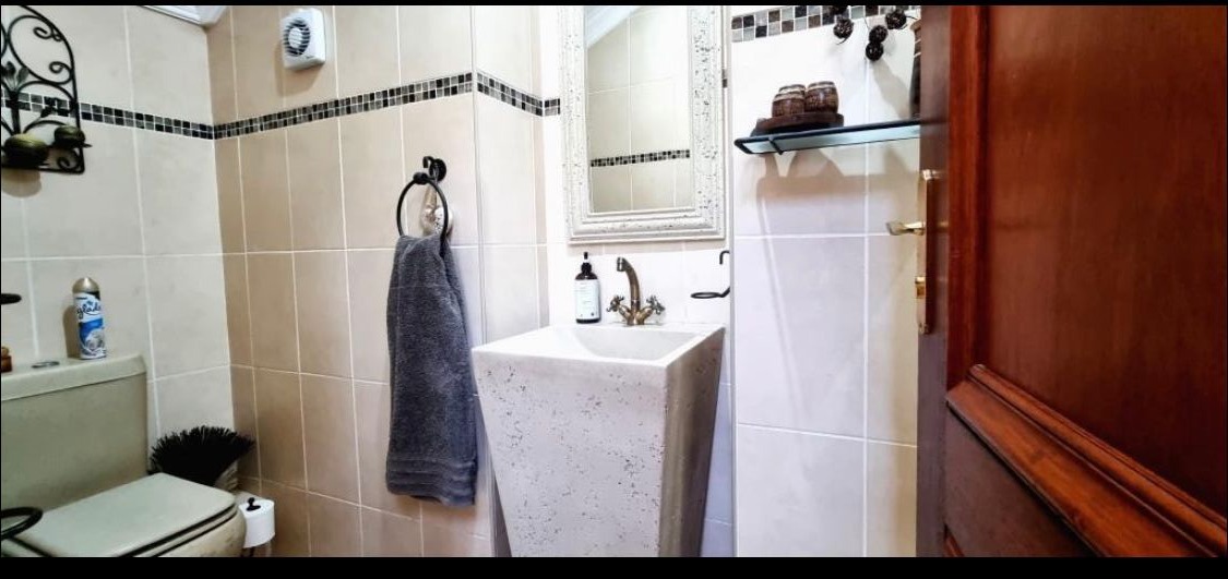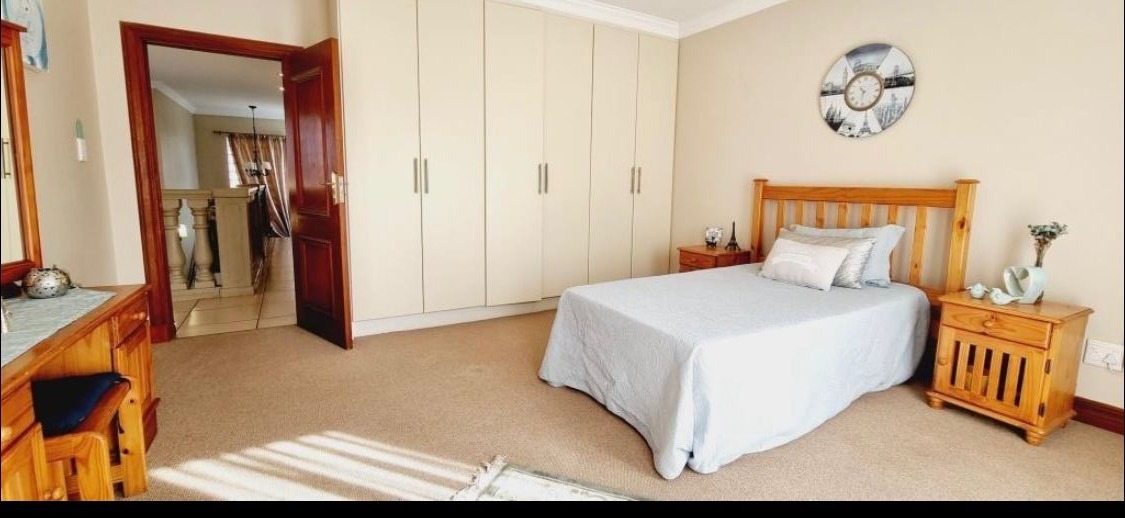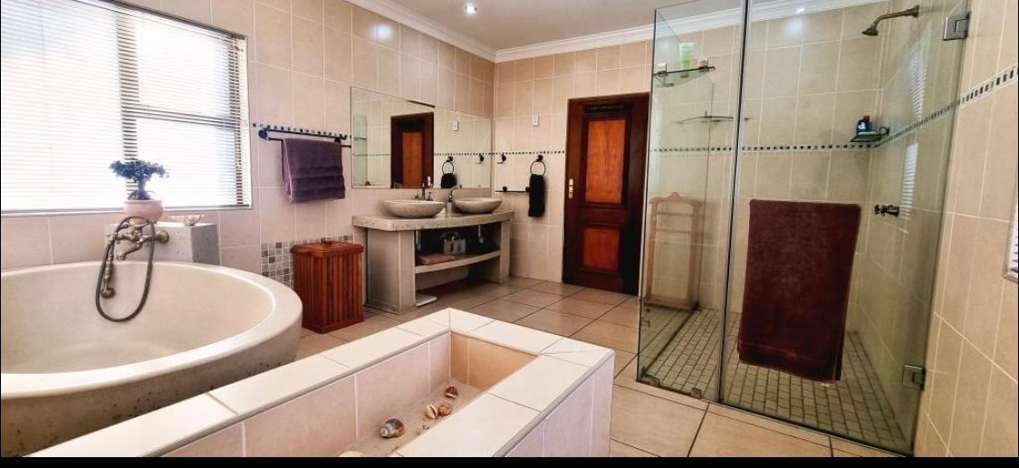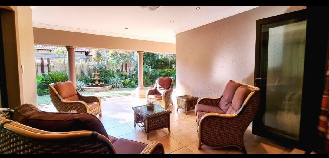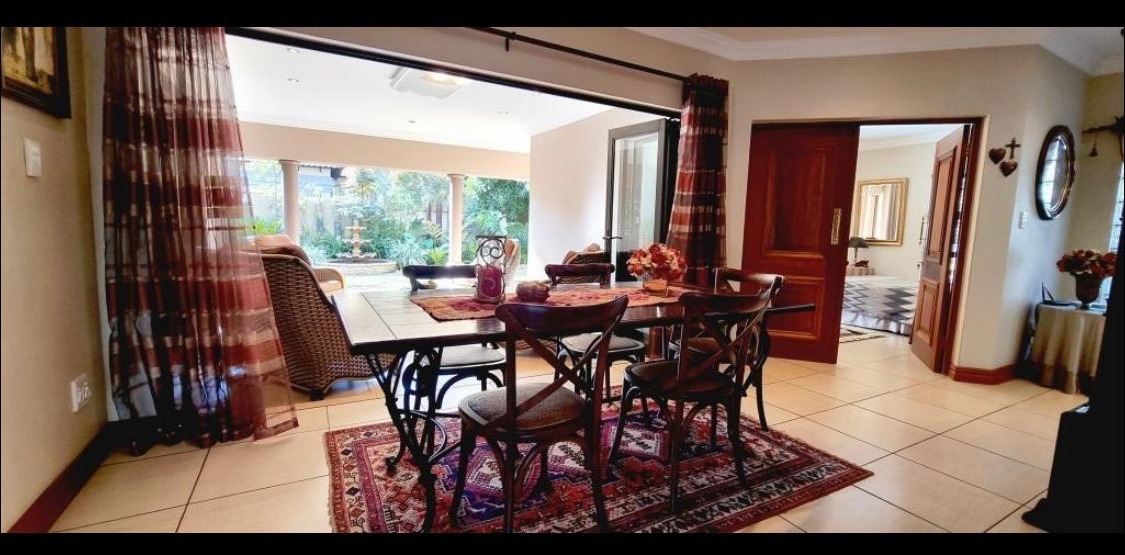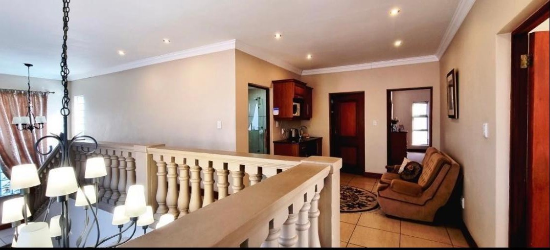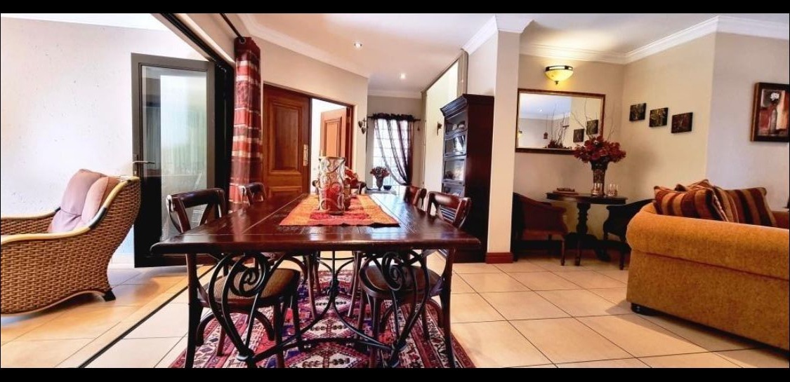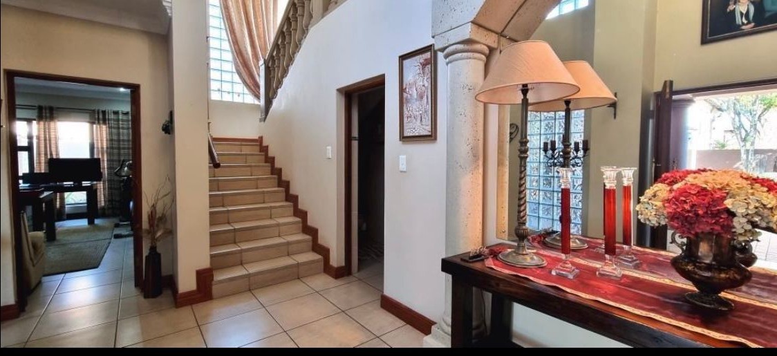 Discover this Exclusive 4-bedroom, 3.5-bathroom residence nestled within a secure golf estate in Moreleta Park, Pretoria. The property immediately impresses with its grand entrance, featuring decorative columns and elegant double wooden doors. Step inside to a spacious, high-ceilinged entryway adorned with pristine tiled flooring, architectural columns, and an arched doorway, setting a sophisticated tone for the home.