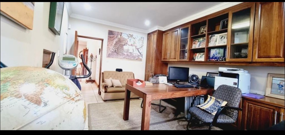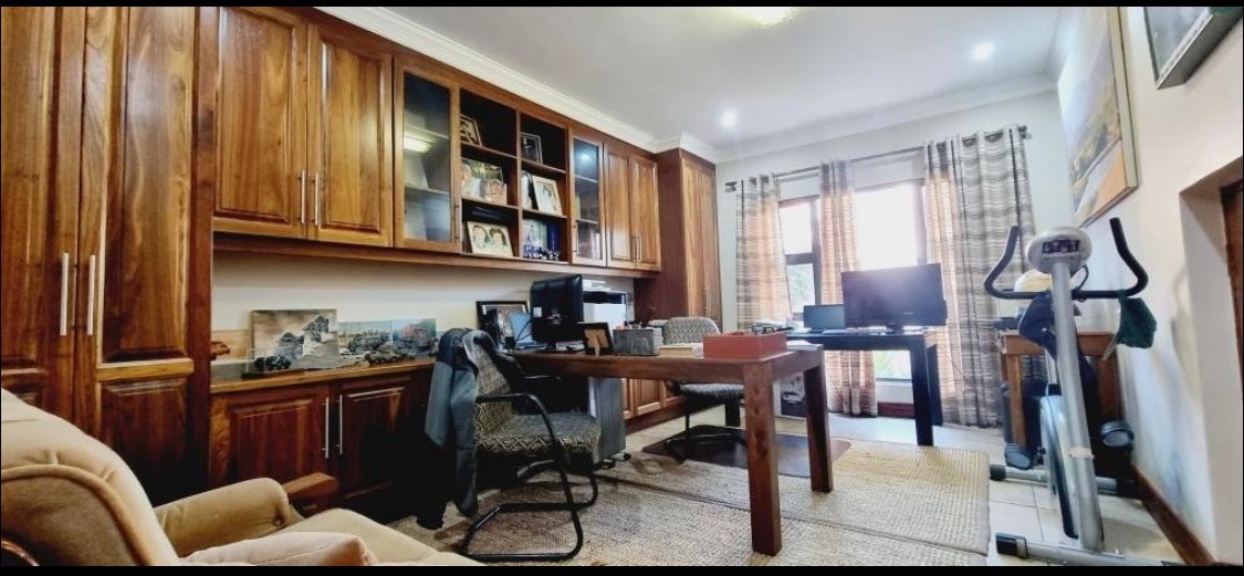 The interior boasts a generous open-plan layout, seamlessly connecting the living and dining areas, all featuring durable tiled flooring and elegant crown molding. Abundant lighting enhances the ambiance. A dedicated home office or study provides extensive built-in wooden cabinetry and a large desk, offering a versatile space for work or hobbies/or as a 5th Bedroom.