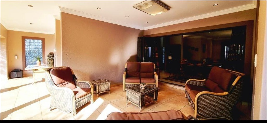 Discover this Exclusive 4-bedroom, 3.5-bathroom residence nestled within a secure golf estate in Moreleta Park, Pretoria. The property immediately impresses with its grand entrance, featuring decorative columns and elegant double wooden doors. Step inside to a spacious, high-ceilinged entryway adorned with pristine tiled flooring, architectural columns, and an arched doorway, setting a sophisticated tone for the home.