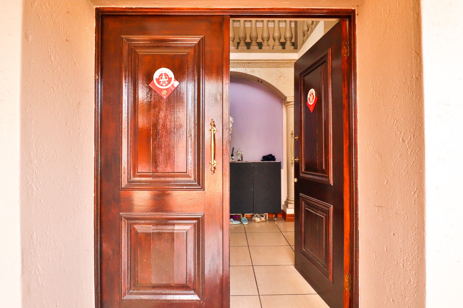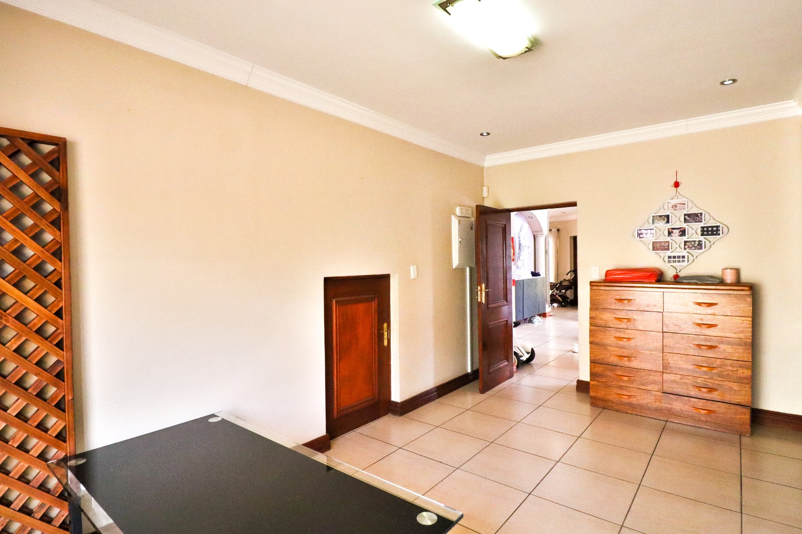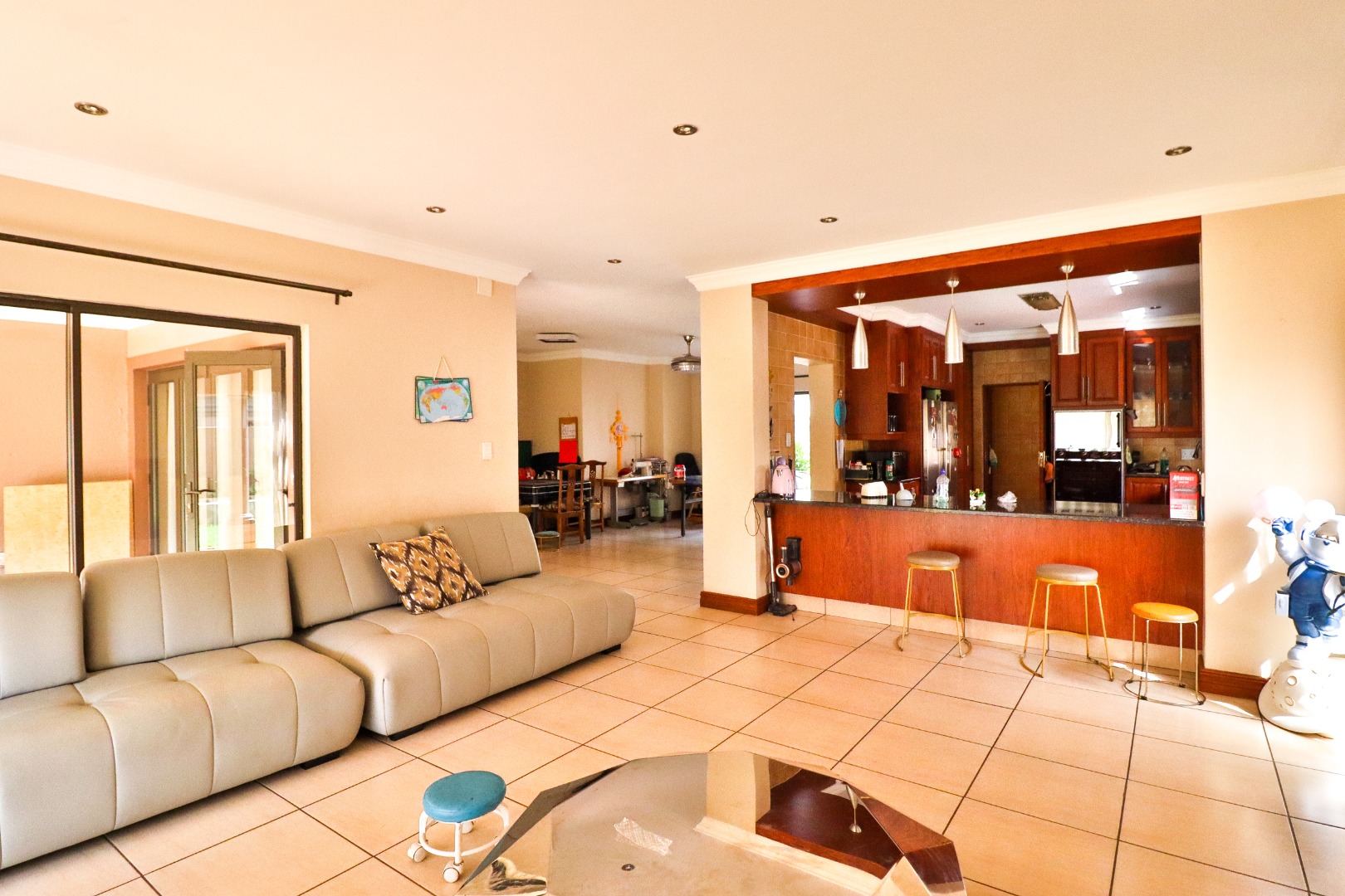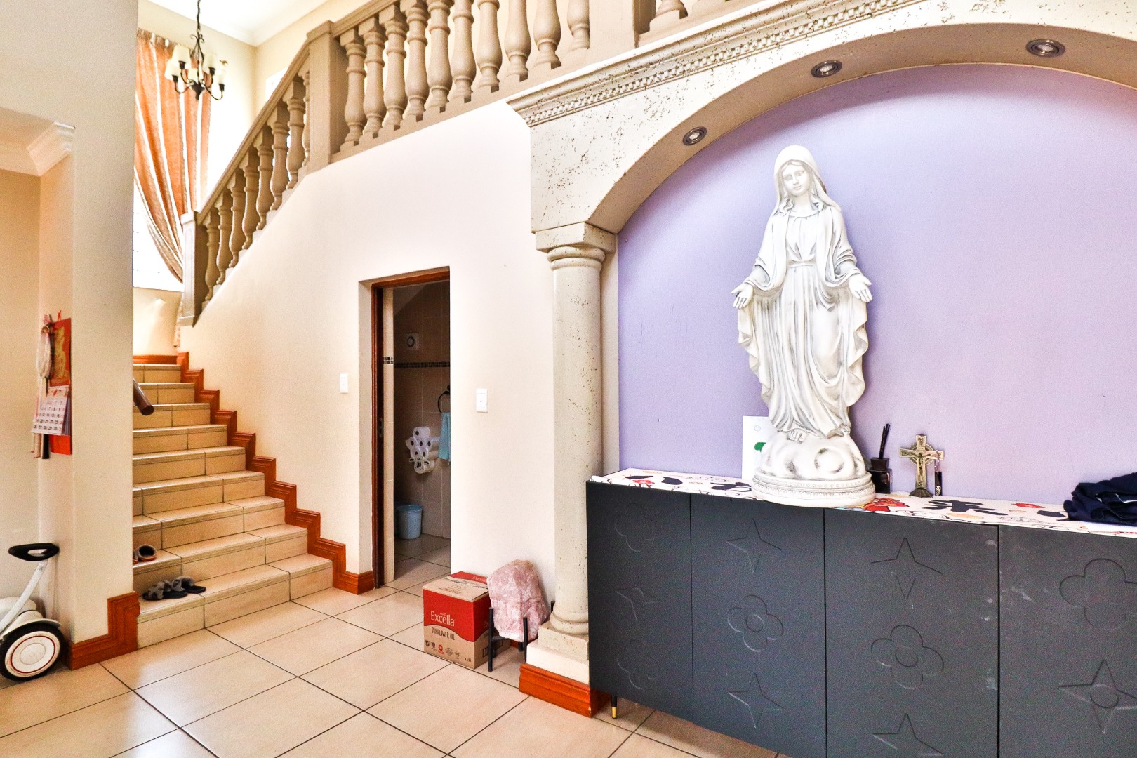 Discover this Exclusive 4-bedroom, 3.5-bathroom residence nestled within a secure golf estate in Moreleta Park, Pretoria. The property immediately impresses with its grand entrance, featuring decorative columns and elegant double wooden doors. Step inside to a spacious, high-ceilinged entryway adorned with pristine tiled flooring, architectural columns, and an arched doorway, setting a sophisticated tone for the home.