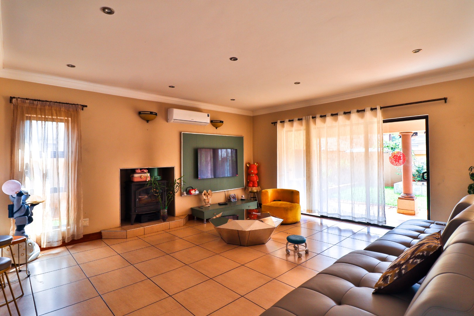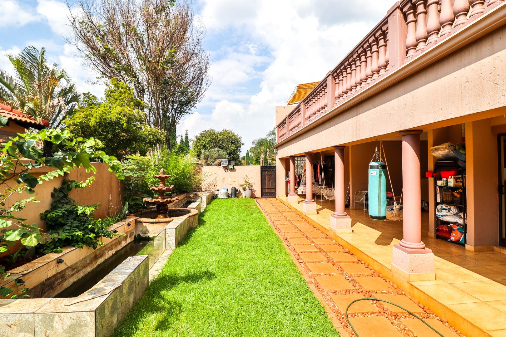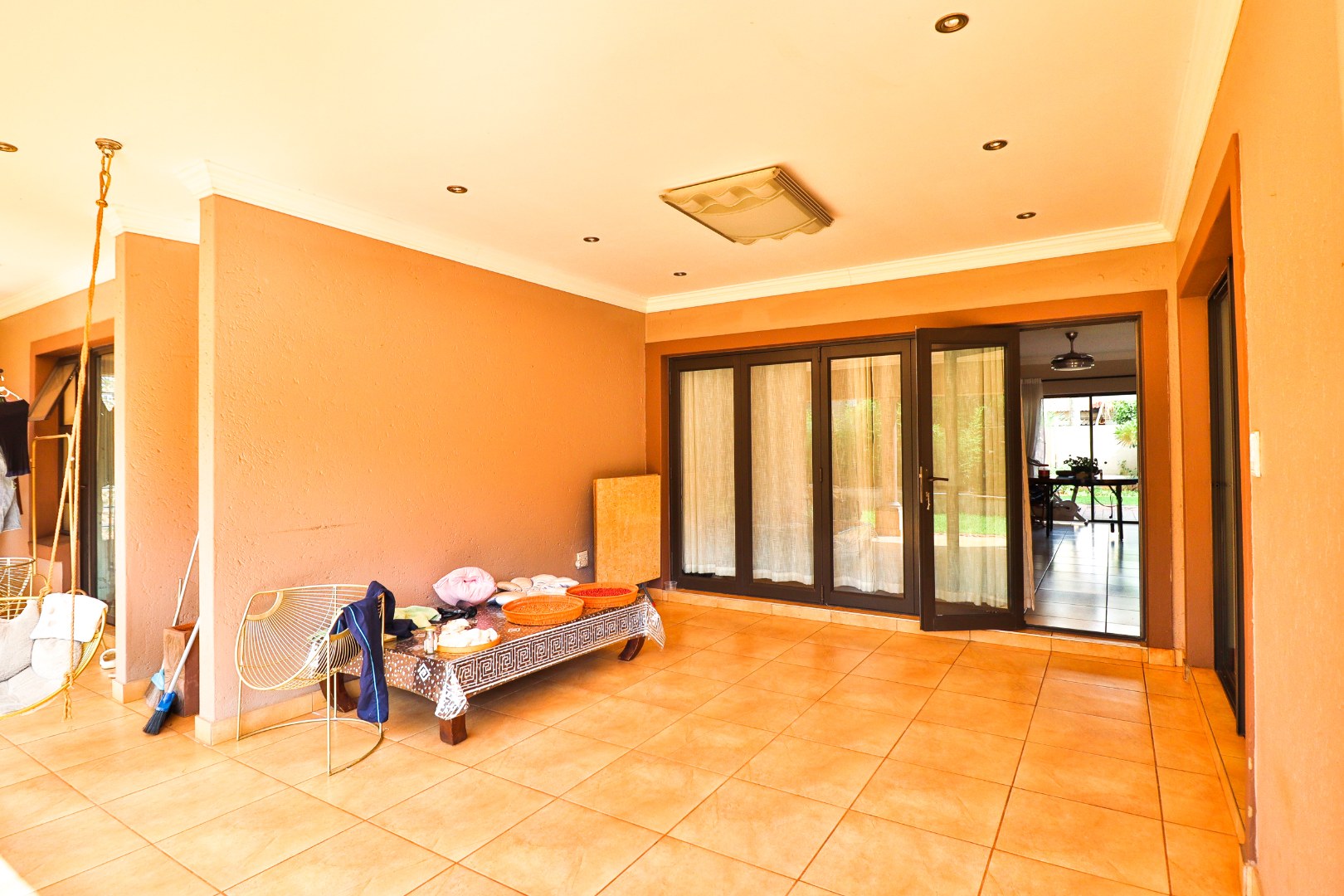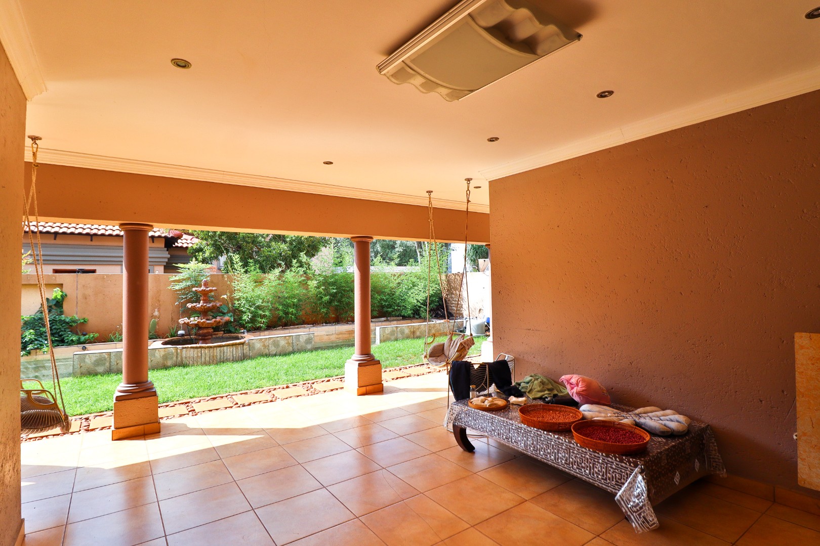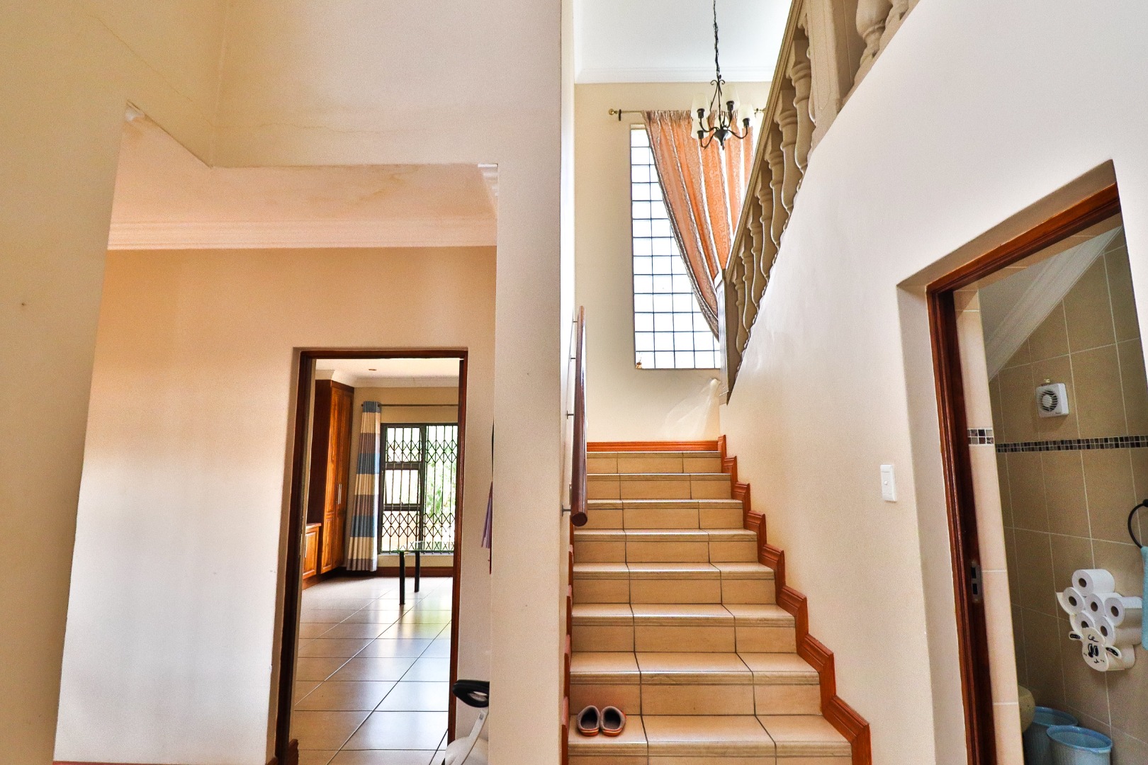 Discover this Exclusive 4-bedroom, 3.5-bathroom residence nestled within a secure golf estate in Moreleta Park, Pretoria. The property immediately impresses with its grand entrance, featuring decorative columns and elegant double wooden doors. Step inside to a spacious, high-ceilinged entryway adorned with pristine tiled flooring, architectural columns, and an arched doorway, setting a sophisticated tone for the home.