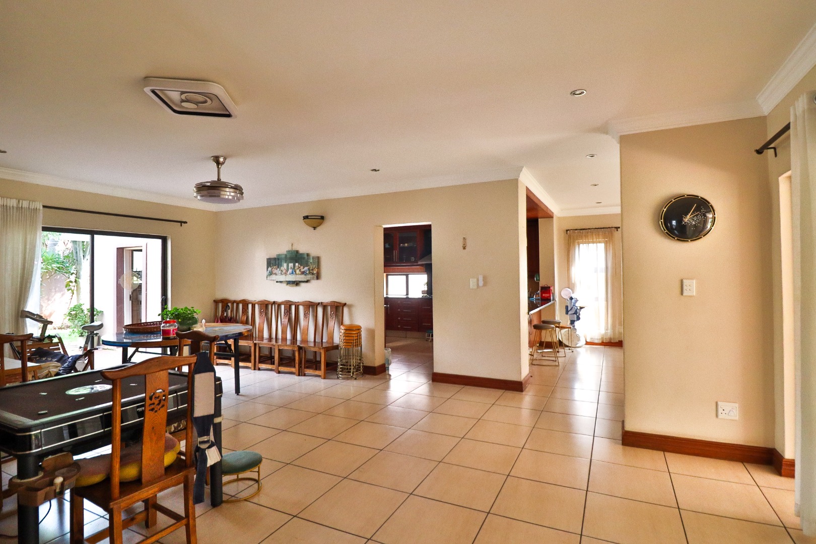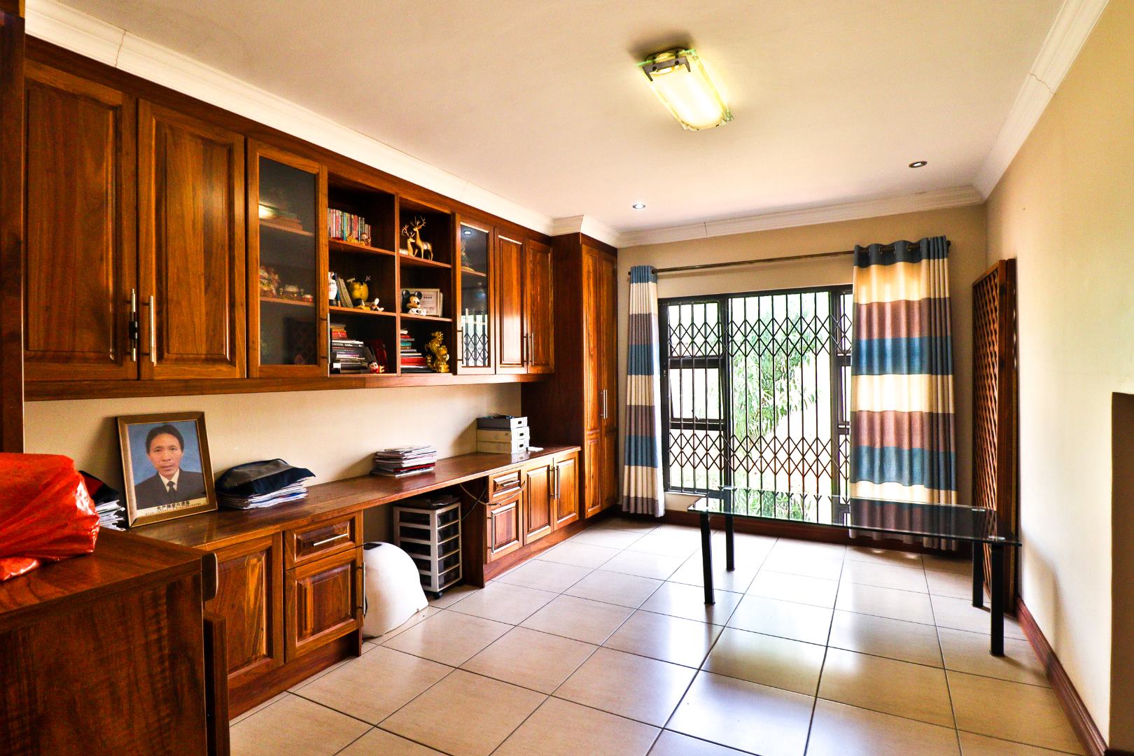 The interior boasts a generous open-plan layout, seamlessly connecting the living and dining areas, all featuring durable tiled flooring and elegant crown molding. Abundant lighting enhances the ambiance. A dedicated home office or study provides extensive built-in wooden cabinetry and a large desk, offering a versatile space for work or hobbies/or as a 5th Bedroom.