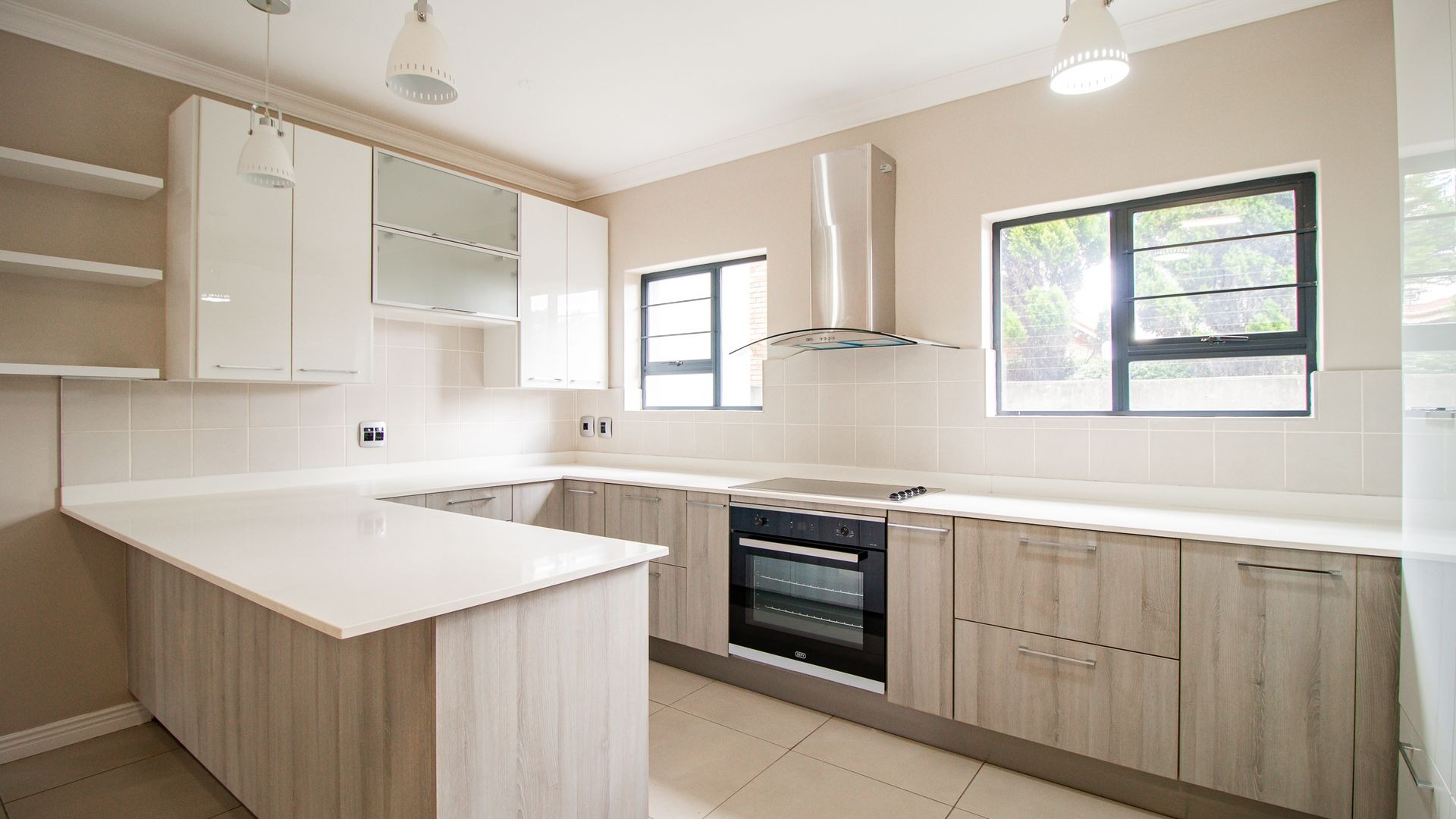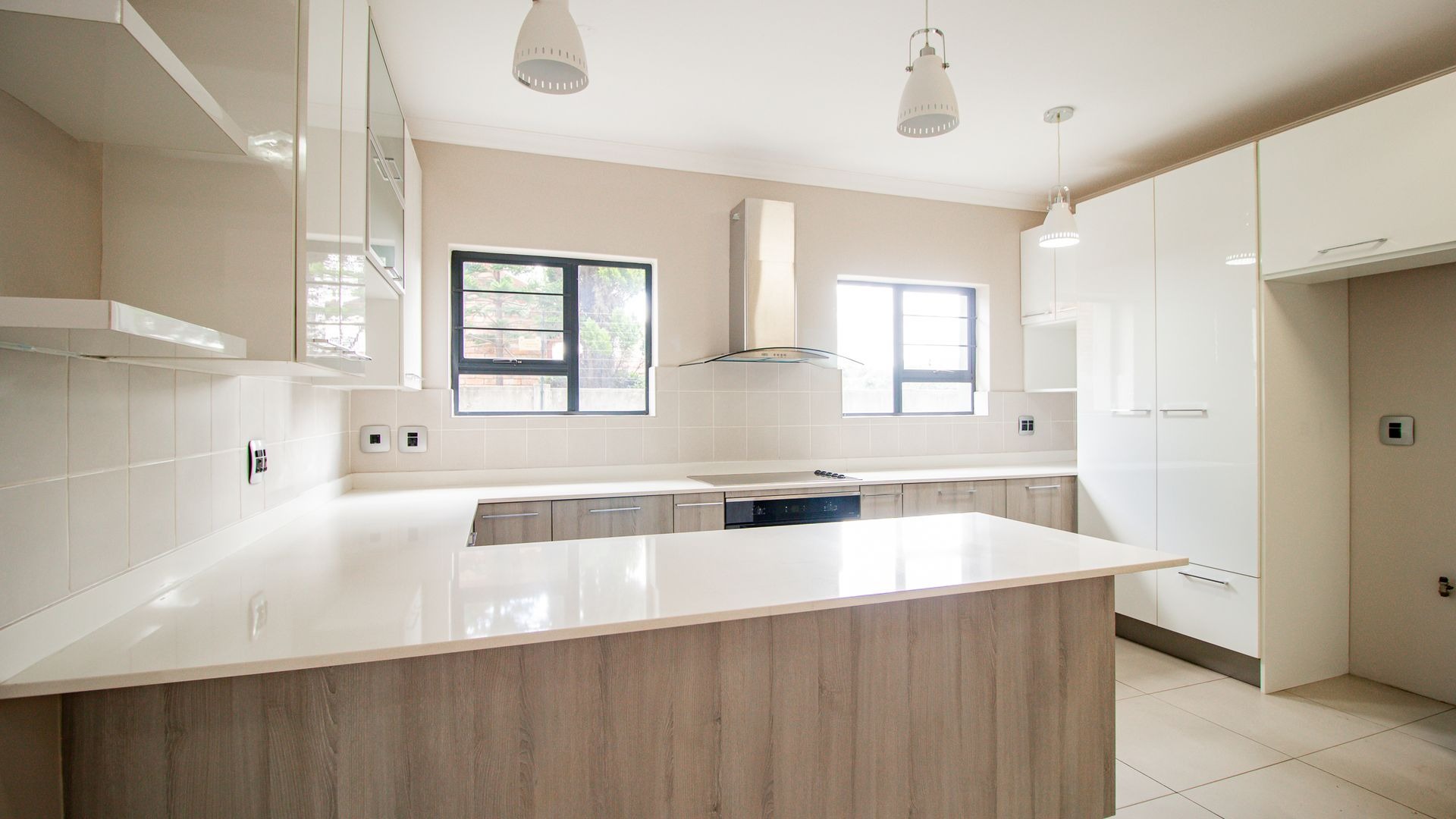 Stylish open-plan kitchen with a concealed scullery, space for two appliances, ample cabinetry, sleek white quartz countertops, an electric hob, oven, and extractor fanFirst Floor:
