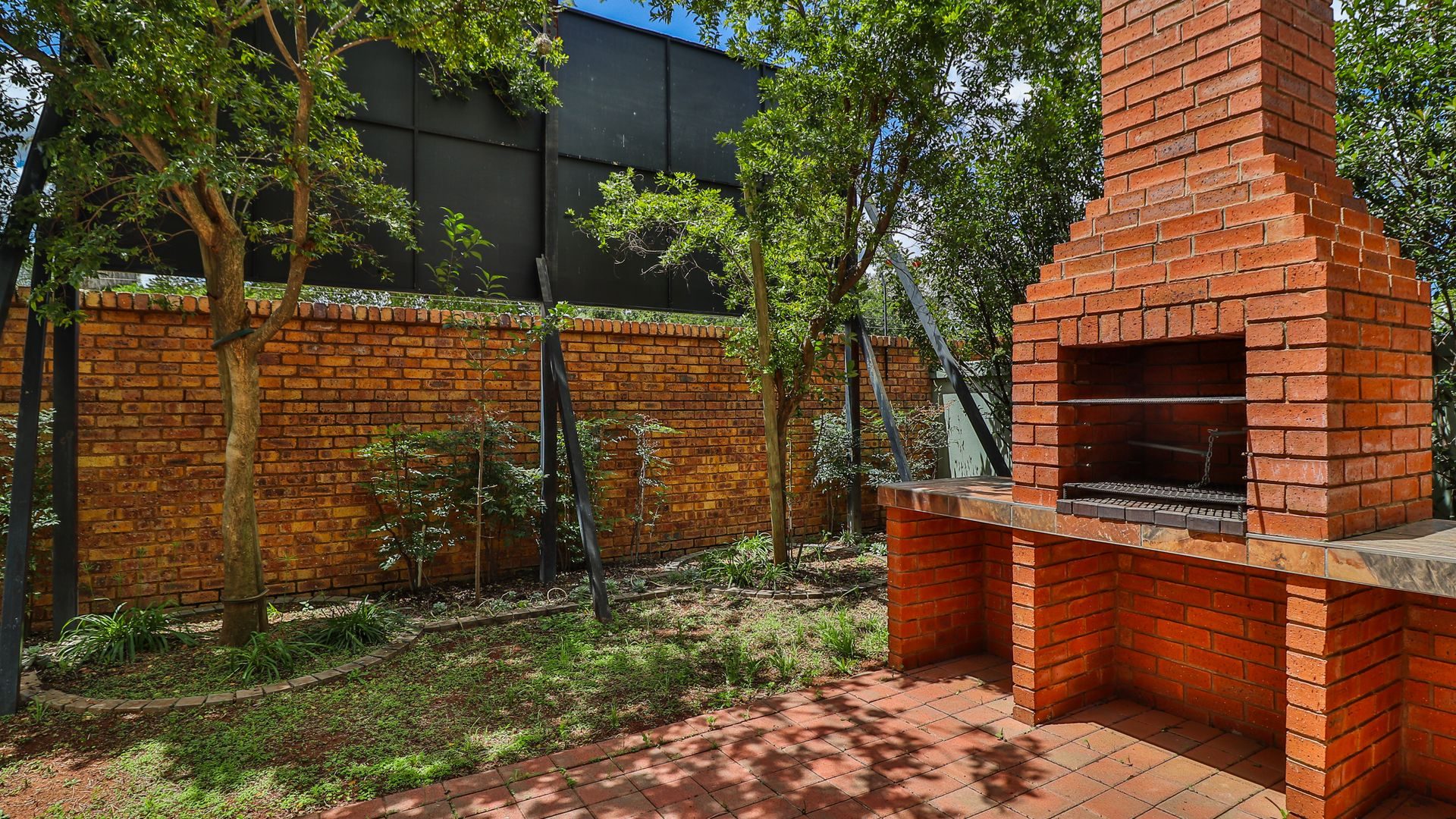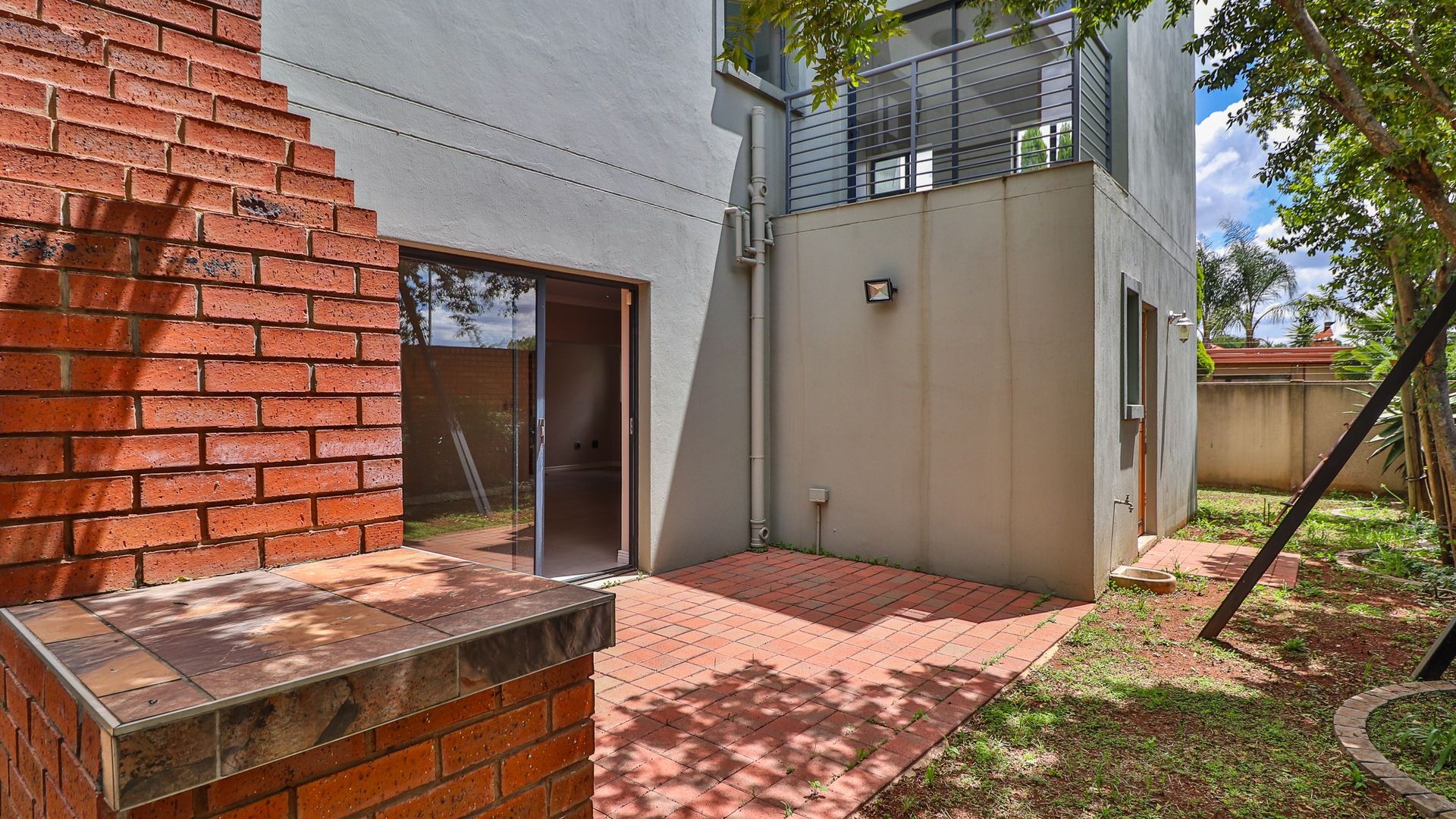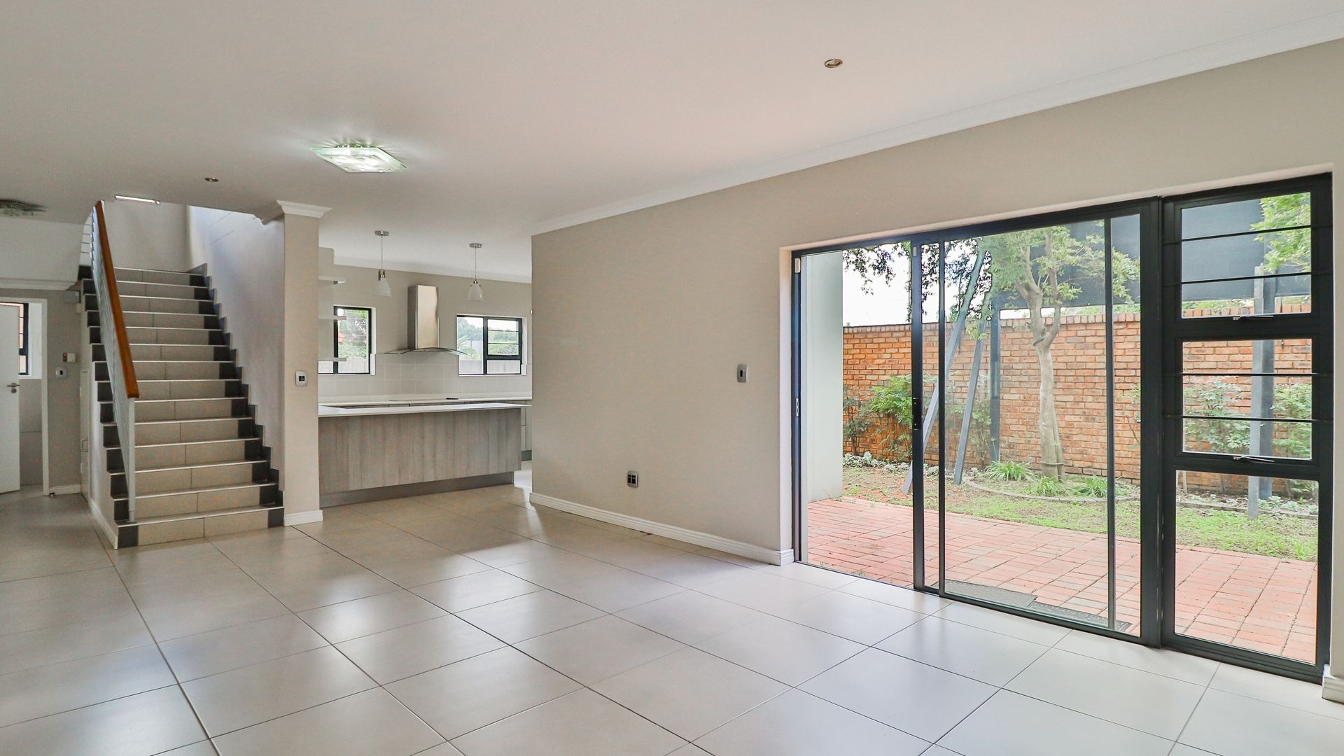 Open-plan living area leading to a tiled patio with a built-in braai