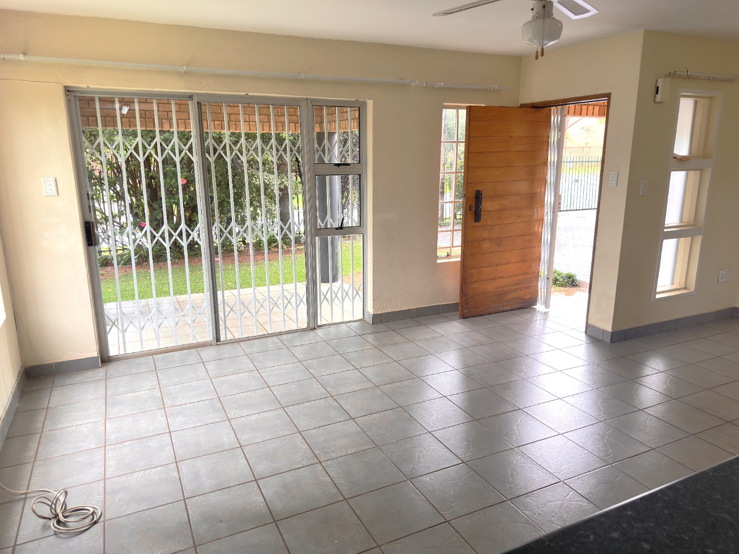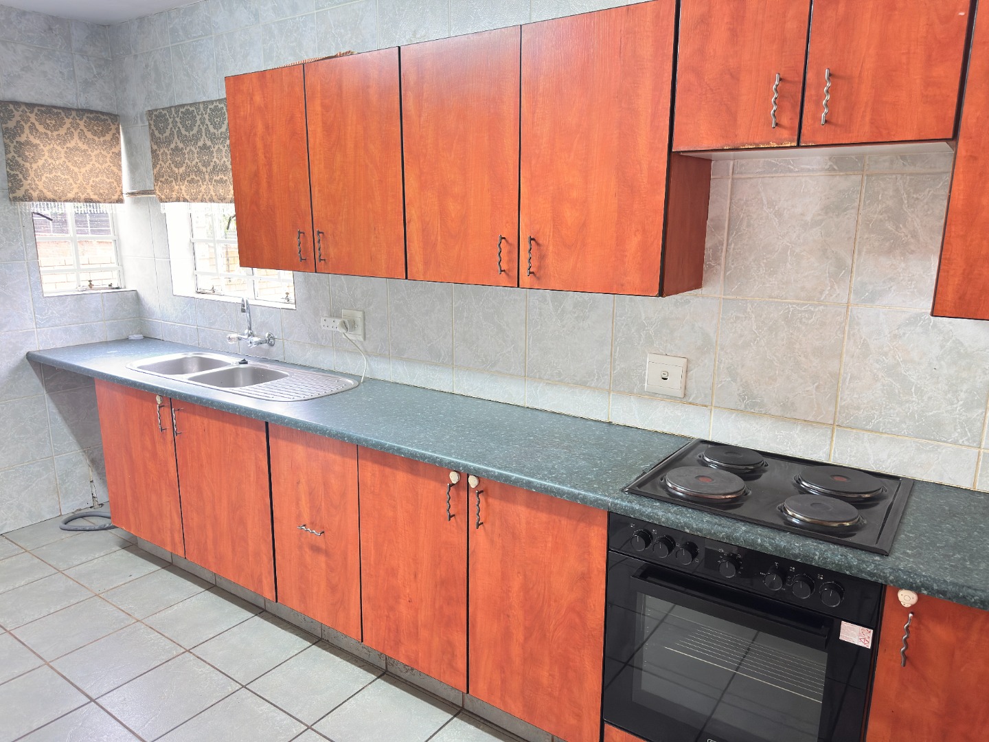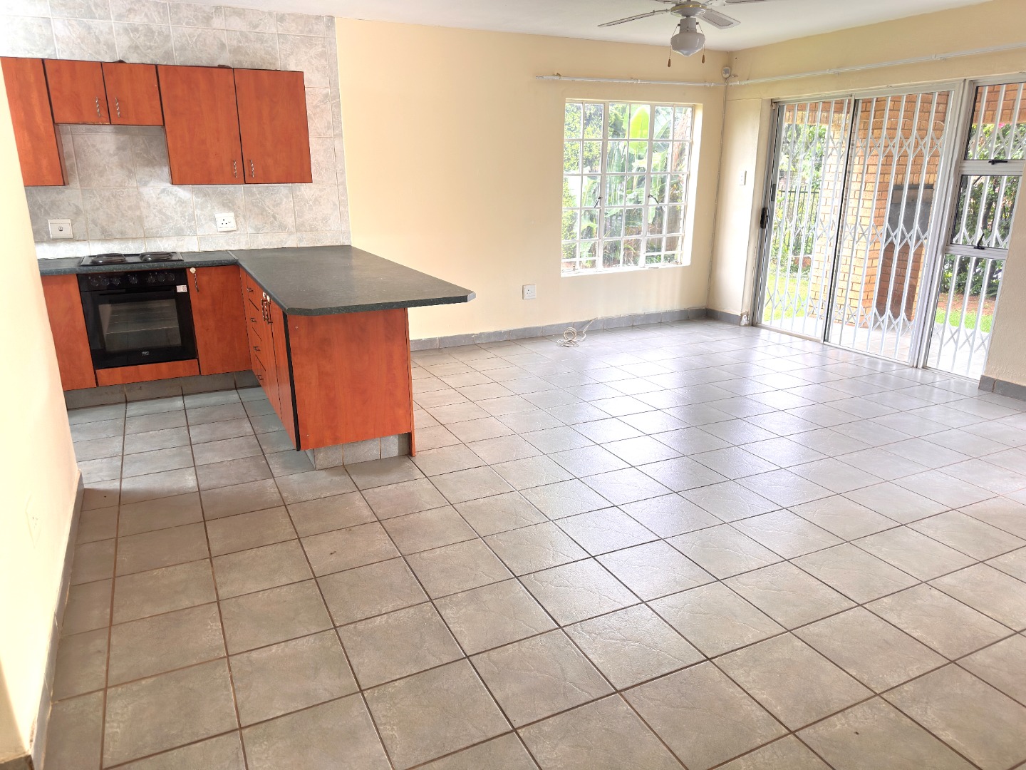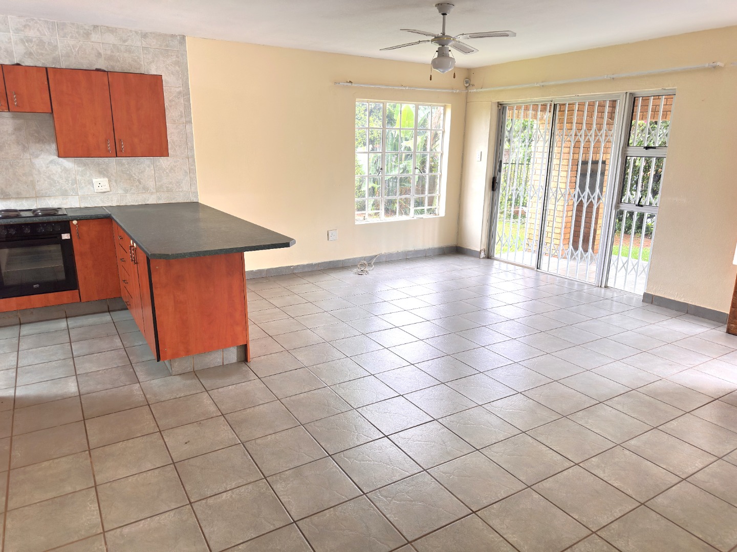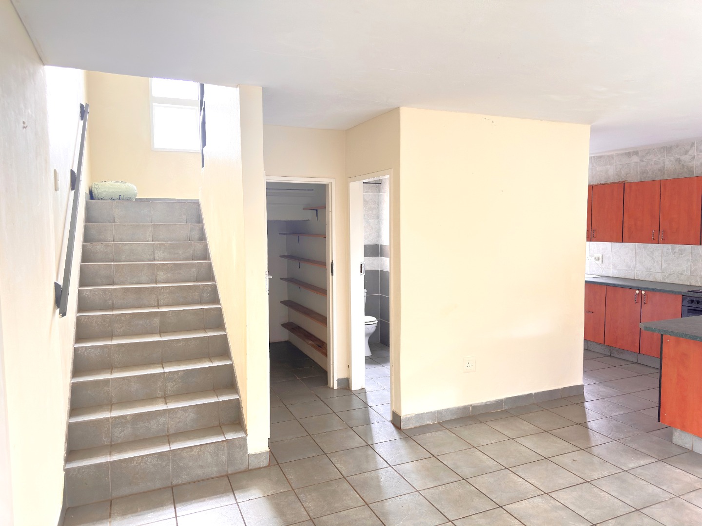 Inside, the residence features an inviting open-plan layout with modern, light grey tiled flooring throughout the main living areas. The property includes a comfortable lounge and dining room, all benefiting from ample natural light. The contemporary kitchen is equipped with dark wood cabinetry, with a grey countertop to match the light grey floor and wall tiles. Ample space allows for a double fridge and under counter appliance, including a pantry or storage space under the staircase.