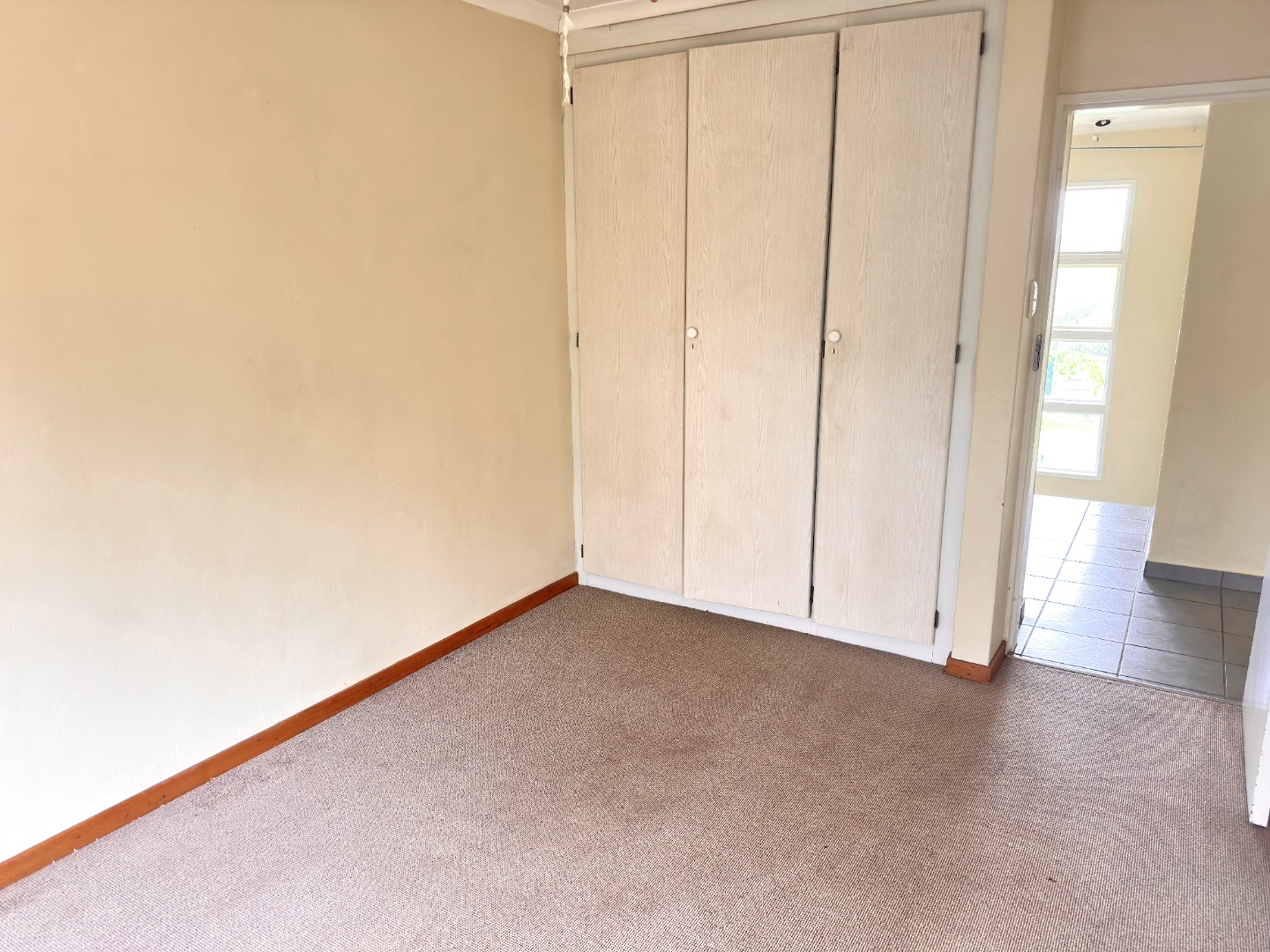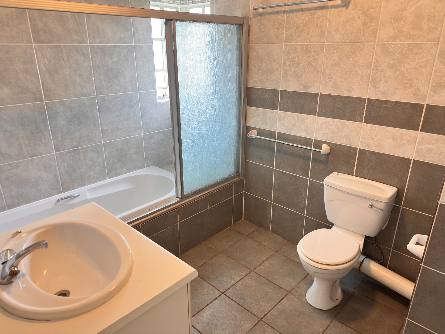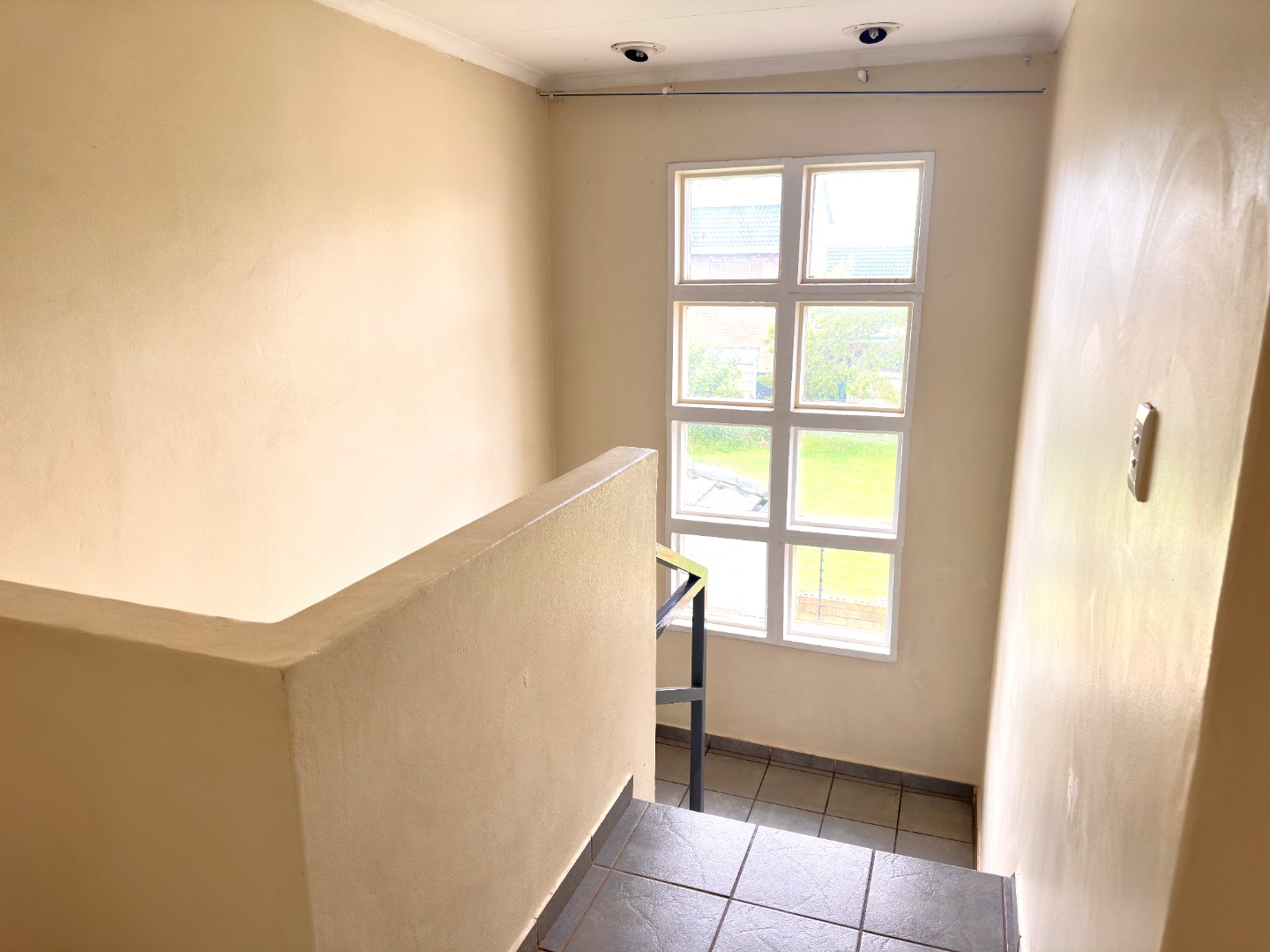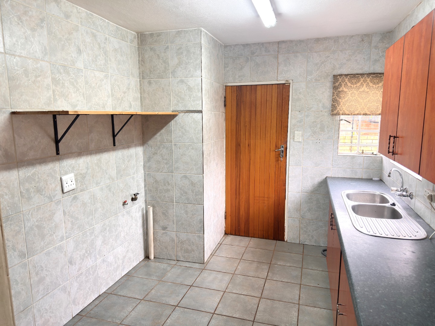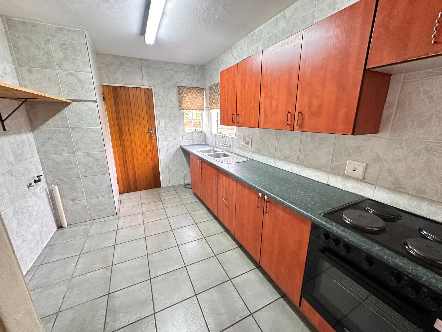Inside, the residence features an inviting open-plan layout with modern, light grey tiled flooring throughout the main living areas. The property includes a comfortable lounge and dining room, all benefiting from ample natural light. The contemporary kitchen is equipped with dark wood cabinetry, with a grey countertop to match the light grey floor and wall tiles. Ample space allows for a double fridge and under counter appliance, including a pantry or storage space under the staircase.